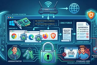 A multi-layered defense-in-depth guide to locking down Windows using Registry policies, DNS over HTTPS, and privilege management to block adult content.