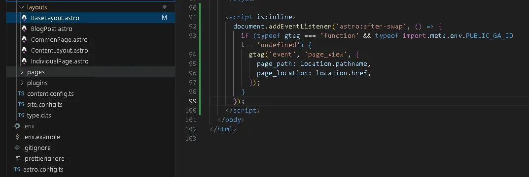 G-XXXXXXXXXXwith your actual ID. ThePUBLIC_prefix is a specific Astro instruction that makes the variable accessible on the client-side (in the browser).Remember to add