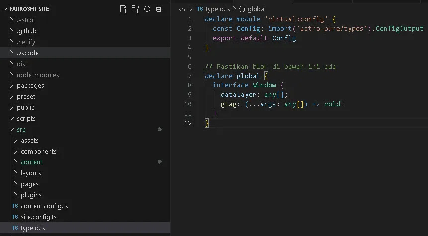 If your project uses TypeScript (as most Astro projects do), you need to inform the TypeScript compiler about the global variables (gtag and dataLayer) that the Google script will create. This prevents errors during development.
