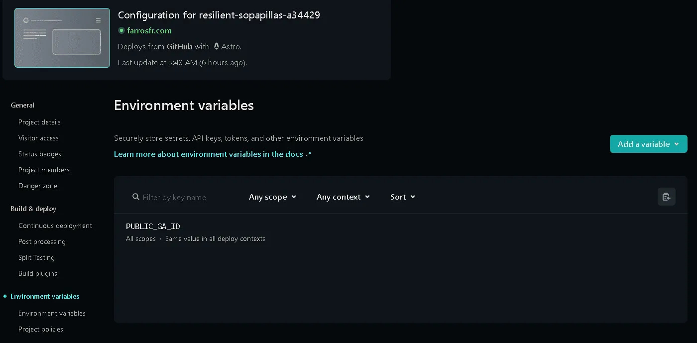 PUBLIC_GA_IDand the Value withG-XXXXXXXXXX.Save and trigger a new deploy to apply the changes.