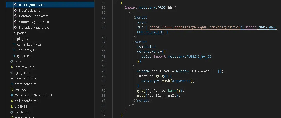 import.meta.env.PROD && (...): Ensures the script only runs when the project is built for production, not during local development.import.meta.env.PUBLIC_GA_ID: Retrieves the ID from the.envfile we created earlier.is:inline: An essential Astro attribute that prevents Astro from processing the script, injecting it directly into the final HTML.