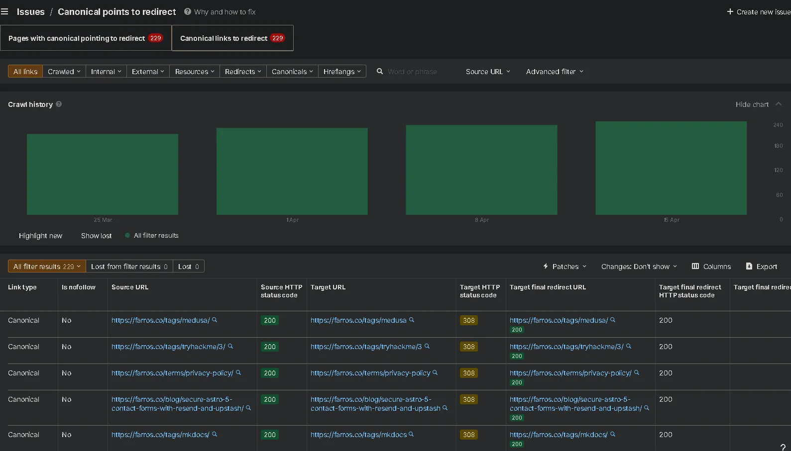 Canonical points to redirect (229 instances)