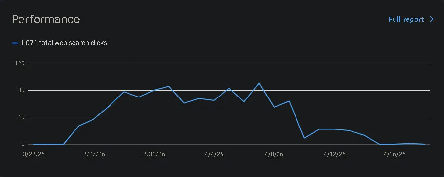 It started with a routine check of Google Search Console (GSC). What I saw was developer’s nightmare: a performance graph that looked like a cliff. After a steady climb to over 1,000 clicks, the traffic suddenly cratered to near zero.