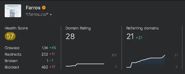 I turned to Ahrefs to get a deeper look at the site's health. The dashboard confirmed: a Health Score of 57 and nearly 500 "Blocked" or redirect-heavy URLs.