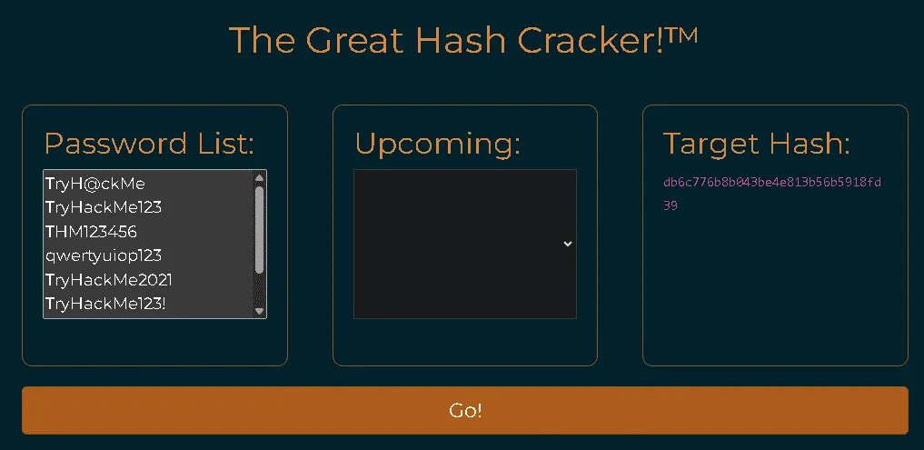 Copy the list of passwords into the "Password List" field of the hash cracker, then click "Go"!