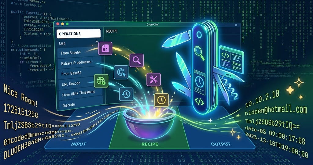 Here i want to share about my write-up for the room CyberChef: The Basics, this room is an introduction to CyberChef, the Swiss Army knife for cyber security professionals. I wrote this in 2025 and hope it is useful for learning about cybersecurity.