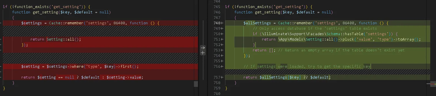 .envmodifications:CACHE_DRIVER=fileSESSION_DRIVER=fileQUEUE_CONNECTION=syncAn error related to a missing 'settings' table, which required adjusting helper configurations to conditionally access the database only if the table exists.