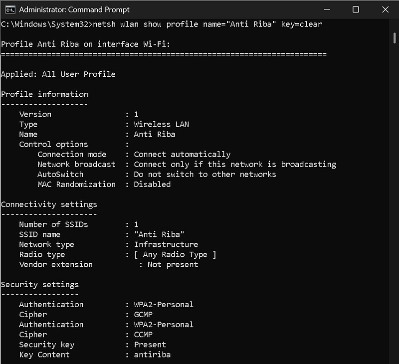 From the picture above, we can see that the Wi-Fi network ‘Anti Riba’ has the password ‘antiriba’.