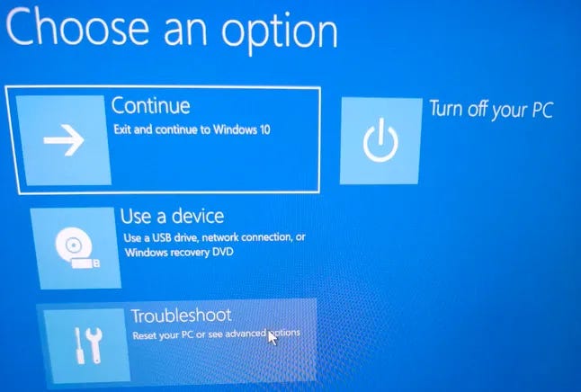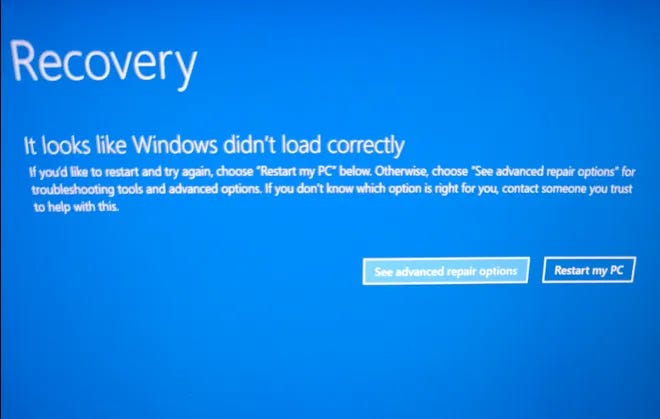 Since we were stuck at login, I triggered Windows Recovery by forcing shutdown three times in a row. That’s actually a built-in behavior: Windows detects repeated failed boots and loads the recovery environment.