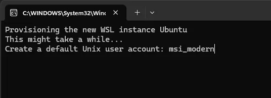 You’ll be prompted to create a default Unix user account. Choose a clean and professional username (for example, your GitHub handle). This becomes your Linux home directory: