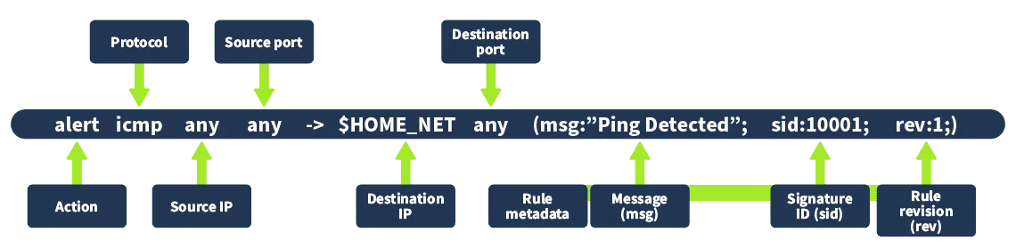Rule metadata: Defined at the end of the rule in parentheses, including Message (msg), Signature ID (sid), and Rule revision (rev).