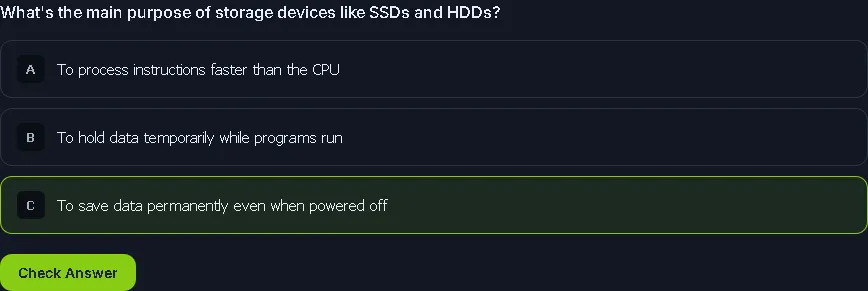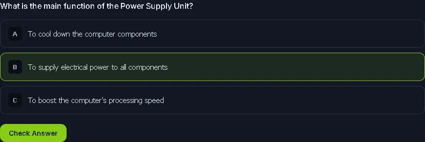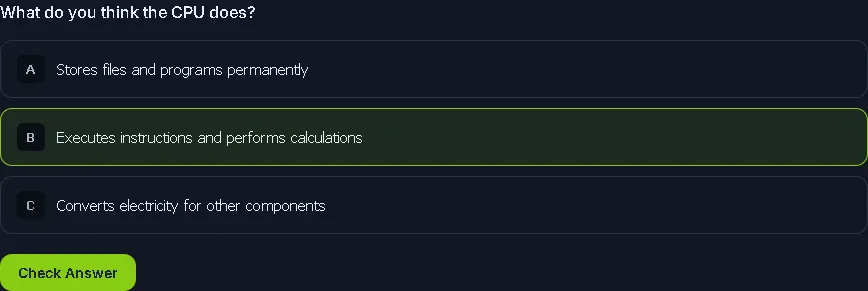 Summary: This section explains that nearly every computer system consists of the same fundamental building blocks, each with a specific job. To make it easier to understand, the lesson uses an analogy comparing PC components to parts of the human body. An interactive static site is provided to explore these components and retrieve a flag.