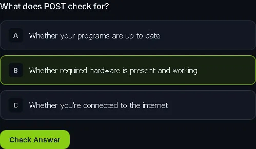 Power-On Self Test (POST): The UEFI tests if all required components are present and functioning correctly.