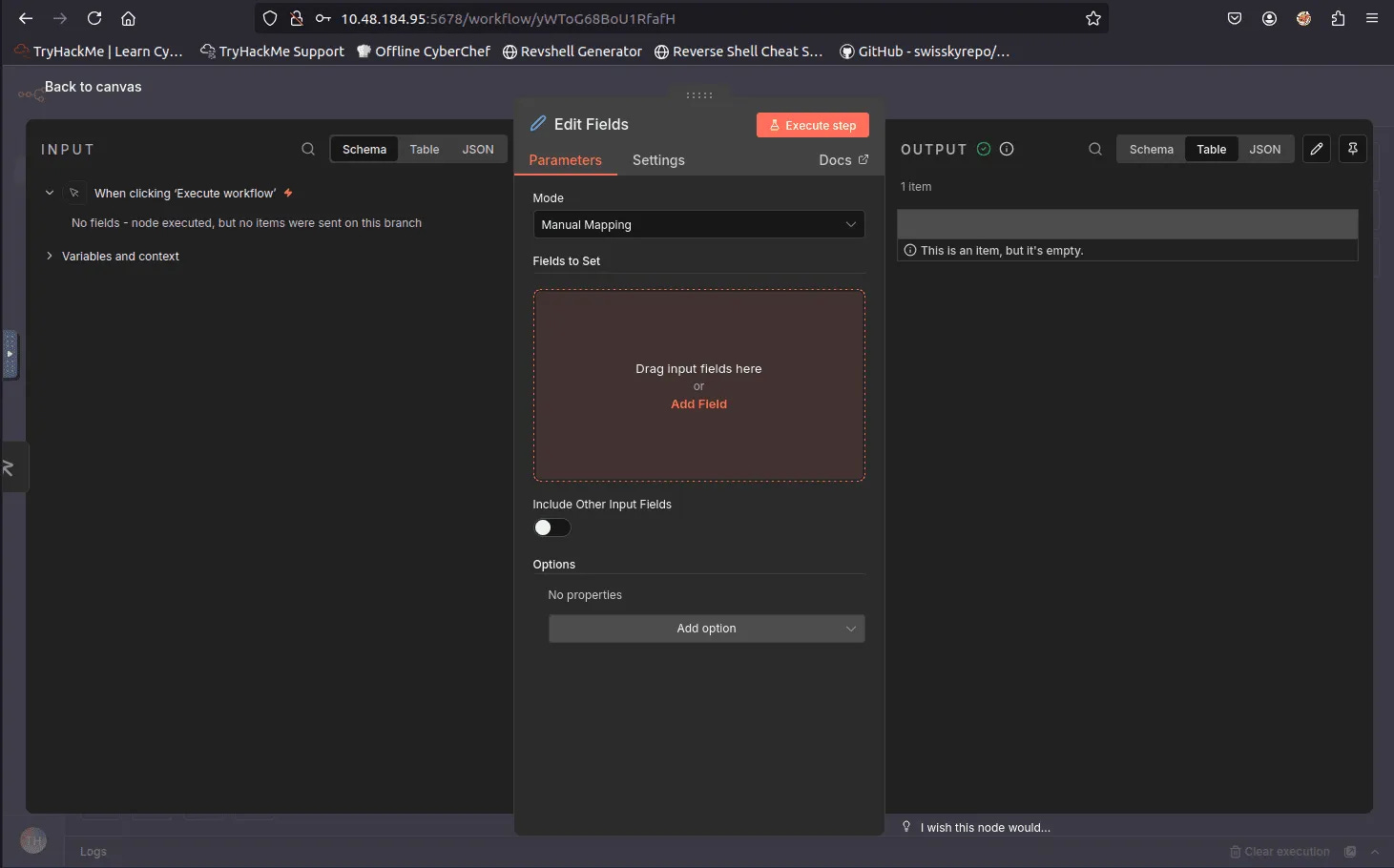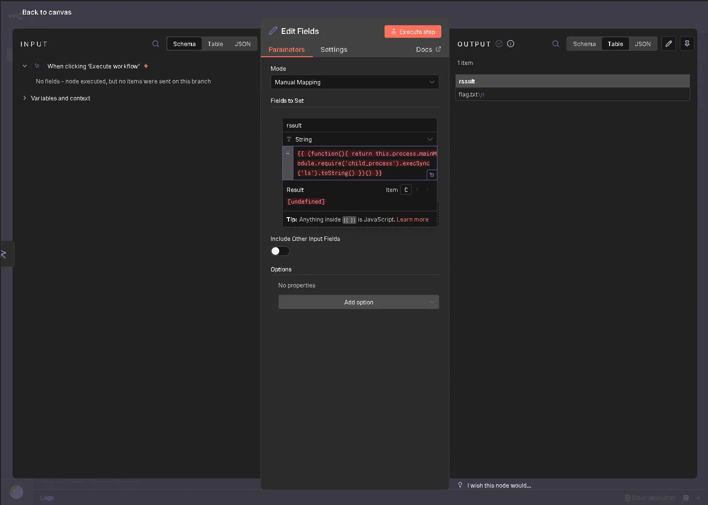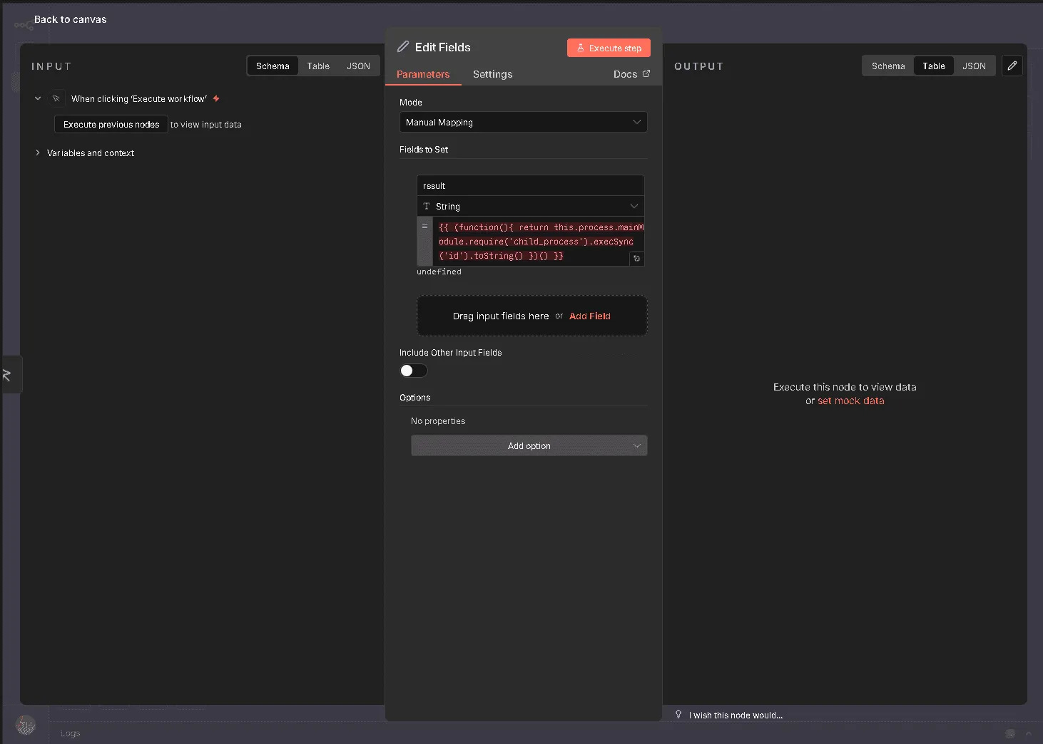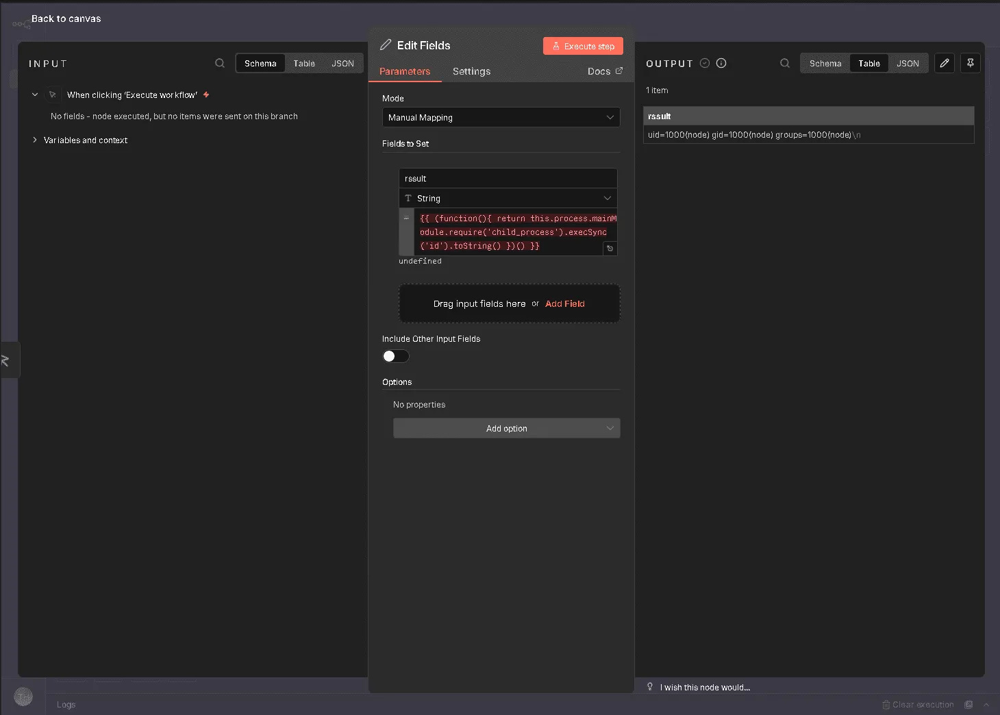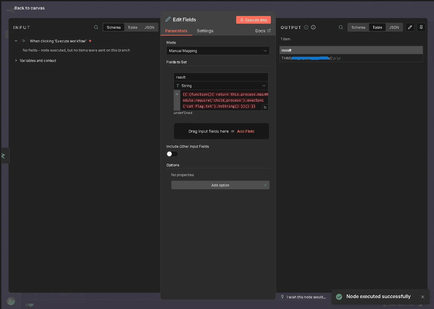 To exploit this vulnerability, an attacker logs into the n8n dashboard (e.g., using tryhackme@thm.local) and creates a new workflow. The method involves adding a "Manual Trigger" connected to an "Edit Fields (Set)" node. Inside the "Edit Fields" node, the attacker adds a new field and pastes the malicious JavaScript payload (containing the sandbox escape code) into the value field. Upon clicking "Execute step," the code runs on the server, and the output of the system command (such as the id command) is displayed in the interface.