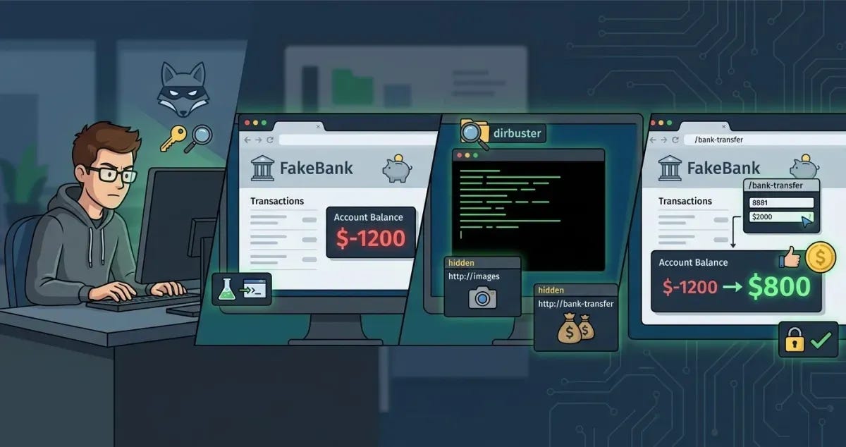 A common web vulnerability is leaving hidden administrative pages accessible. You will use a terminal-based hacking tool called dirb to find these pages. By running the command dirb http://fakebank.thm, the tool will scan the website and reveal hidden directories marked with a +.
