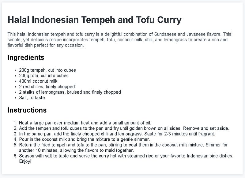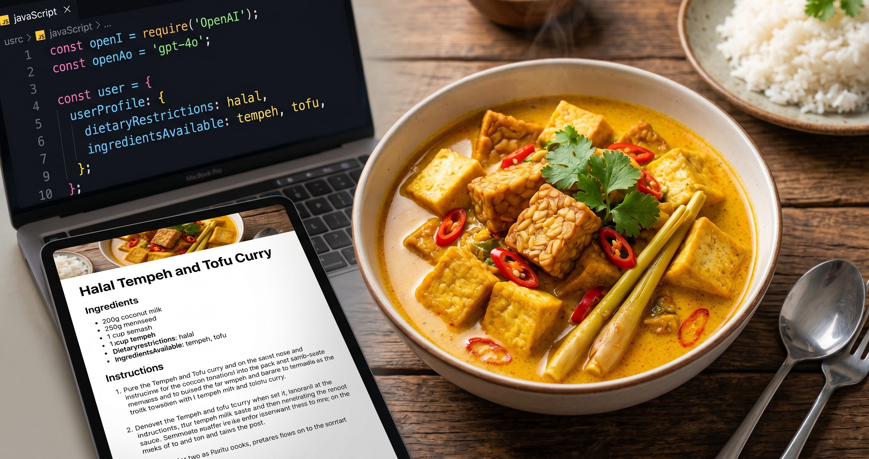 dietaryRestrictionsset to'halal'cuisinePreferencesset to'Indonesian, Sundanese, Javanese'ingredientsAvailableset to'tempeh, tofu, coconut milk, chili, lemongrass'
