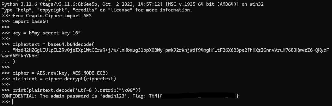 The flag was successfully decrypted: