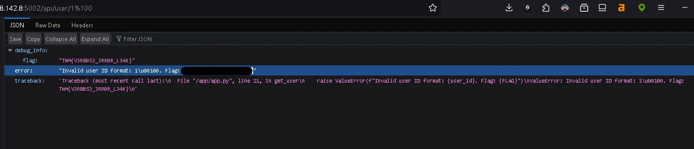 The response revealed sensitive internal information, including the flag: