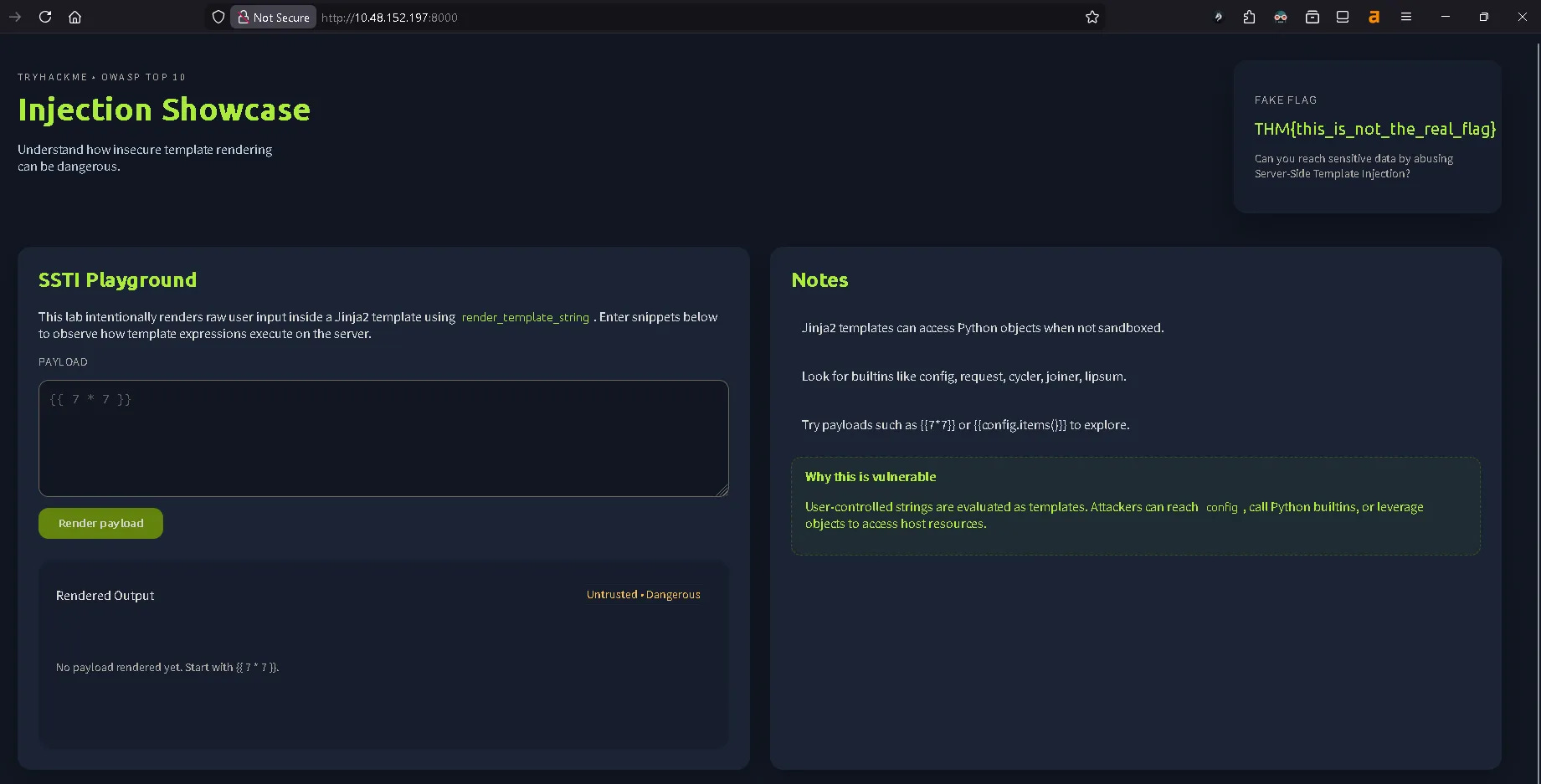 Try payloads such as {{7*7}} or {{config.items()}} to explore.