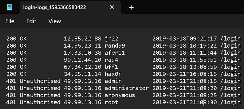 The attacker attempts to log in by trying different usernames and passwords repeatedly to guess the correct one. We can see multiple unsuccessful login attempts (HTTP 401 Unauthorized) from the same IP address (49.99.13.16) with different usernames (admin, administrator, anonymous, root).