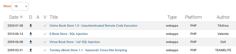 First, open https://www.exploit-db.com/ to check for vulnerabilities using the keyword ‘book store’ and verify the results.