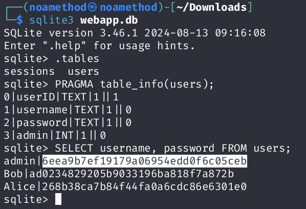 Opens the SQLite command-line interface and connects to the webapp.db database with sqlite3 webapp.db. Lists all the tables in the database with .tables to view the sessions and users tables. Then, run PRAGMA table_info(users); to view the columns. After that, execute the script SELECT username, password FROM users; to retrieve specific details about the admin's password.