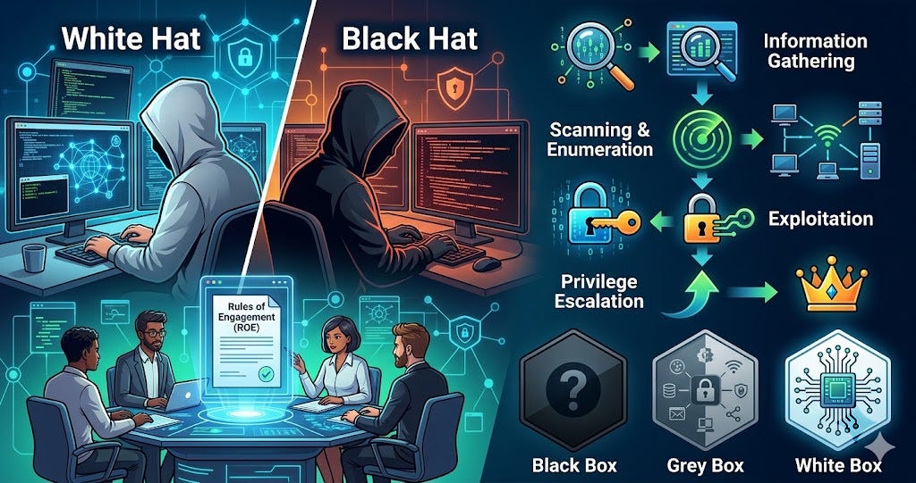 A penetration test follows the “Rules of Engagement” (ROE), a document outlining permission, test scope, and allowed techniques, ensuring legality and ethical clarity throughout the process.