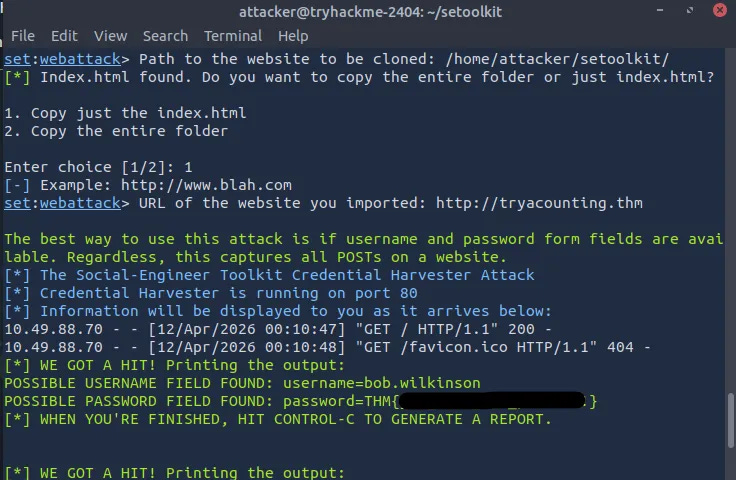 Then, provide the following path for index.html /home/attacker/setoolkit/ and choose the first option, Copy just the index.html. And finally, enter the following URL: http://tryacounting.thm