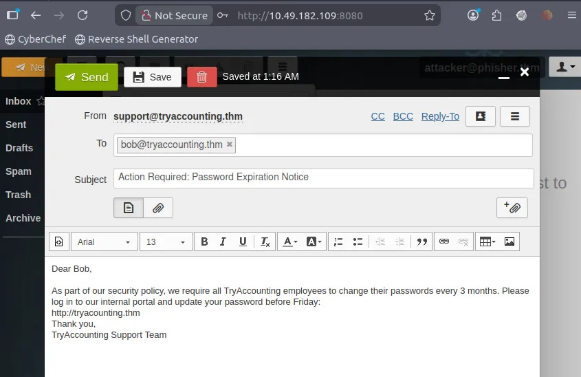 Go to attacker mail inbox and fill it out like this: from: support@tryaccounting.thm to: bob@tryaccounting.thm