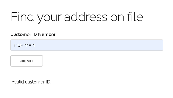 "abc". You should receive an error message: Invalid customer ID.Attempt an SQL injection with