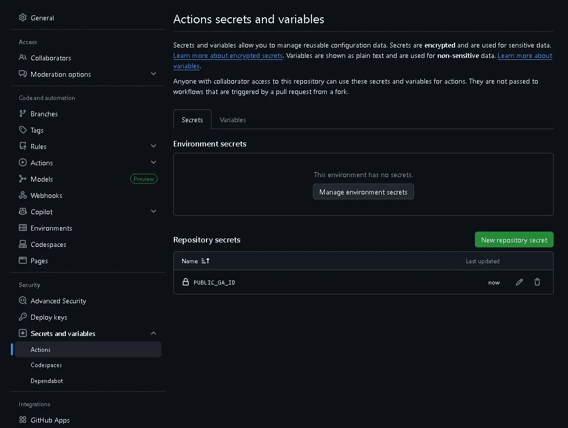 Finally, we make sure the Measurement ID is available during the build process. If you're deploying to GitHub Pages, this can be done using GitHub Actions secrets.