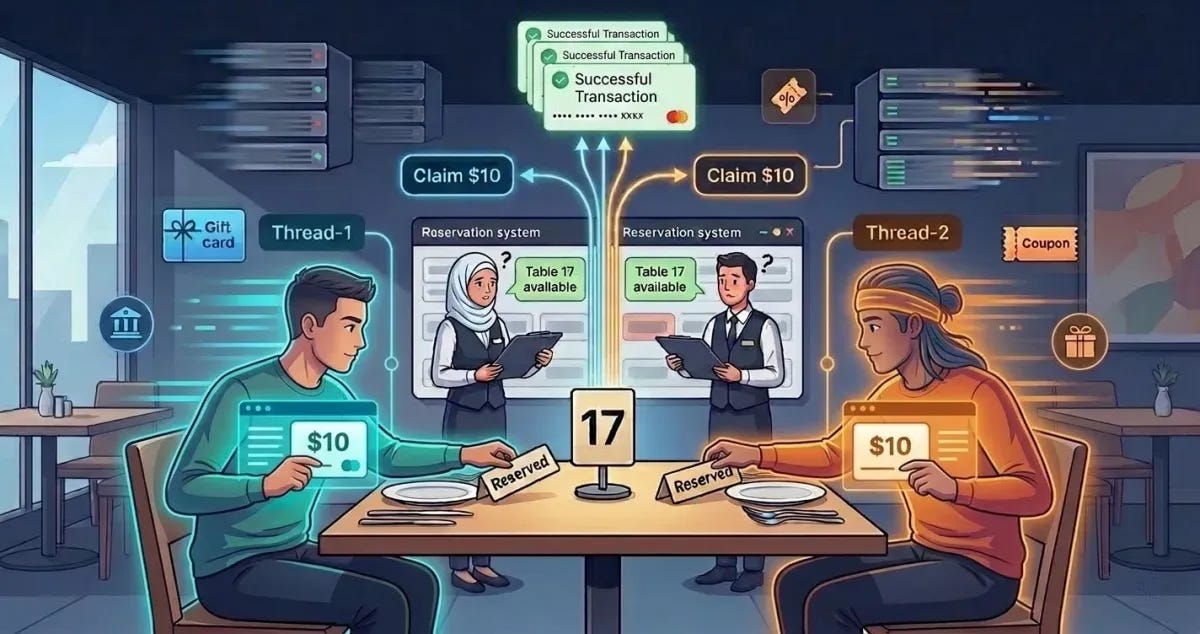 Race conditions are explained using a real-world analogy of two people trying to reserve the same restaurant table at the exact same time. In software, this is known as a Time-of-Check to Time-of-Use (TOCTOU) vulnerability. If two concurrent threads check a bank balance of $100 and both try to withdraw $50 simultaneously, the lack of proper synchronization might allow both withdrawals to process before the system updates the final balance. This occurs frequently due to parallel execution, concurrent database operations, or poorly designed third-party API integrations.