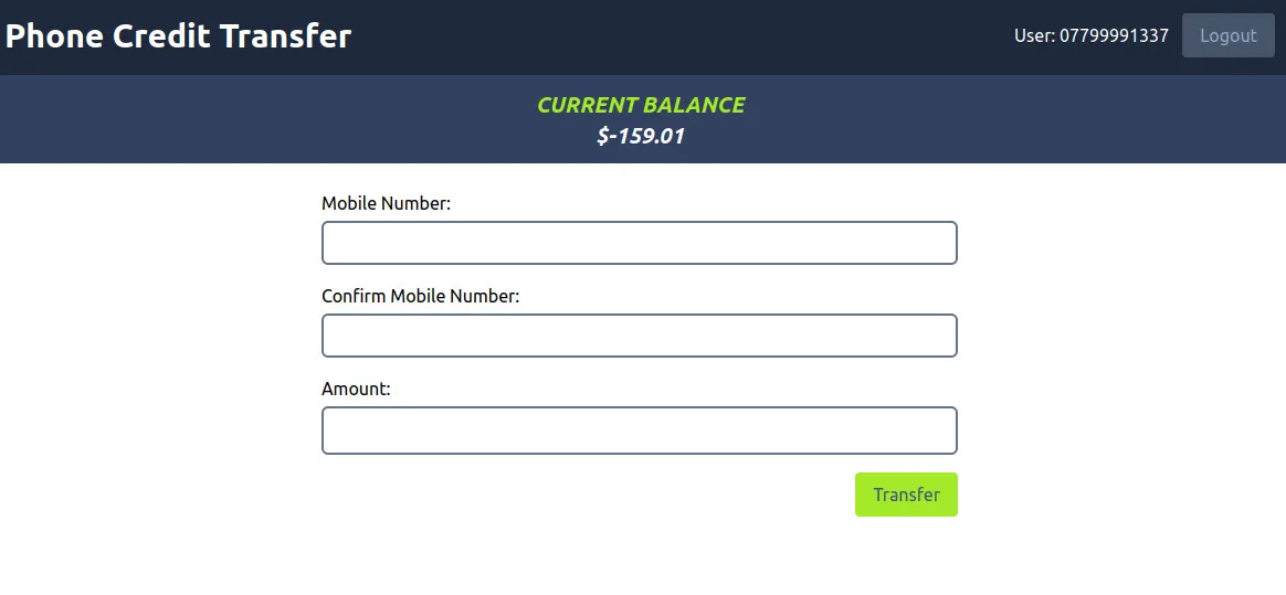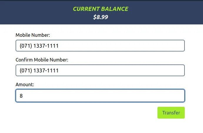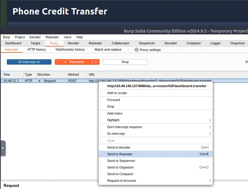 Then we try to transfer with $8 because the current balance is $8.99. Don't forget to turn on the foxyproxy and burp suite to intercept.