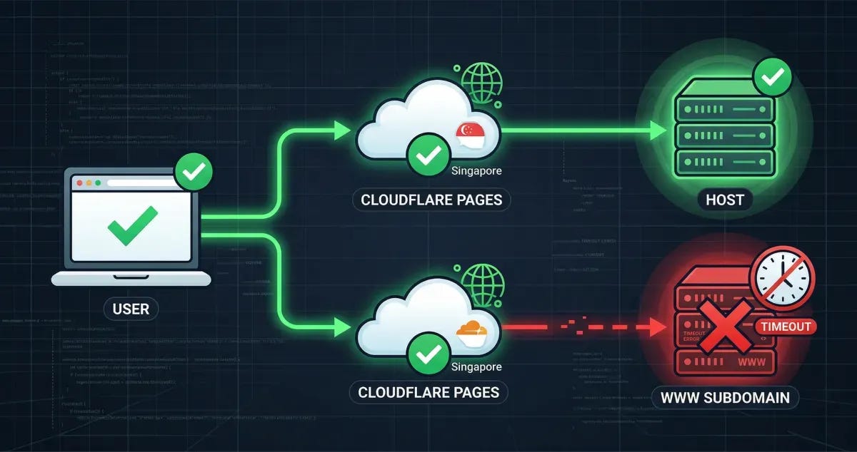 Think of it like calling a friend on the phone. Cloudflare dials the number, but the phone just rings and rings until the call eventually drops. Cloudflare is telling you, "I tried to reach your server, but it ghosted me." Usually, this means a server is down or overloaded. However, in the case of Cloudflare Pages, your server isn't broken at all. It is ignoring the request on purpose because of a strict nametag policy.