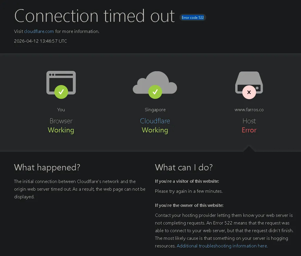 An Error 522 (Connection timed out) happens when Cloudflare (acting as the middleman) tries to connect to your web server (where your website actually lives), but the server takes too long to respond or doesn't respond at all.