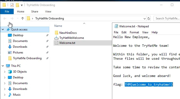 Explore the TryHatMe Onboarding folder located on your computer's Desktop. What is the flag value found within Welcome.txt?