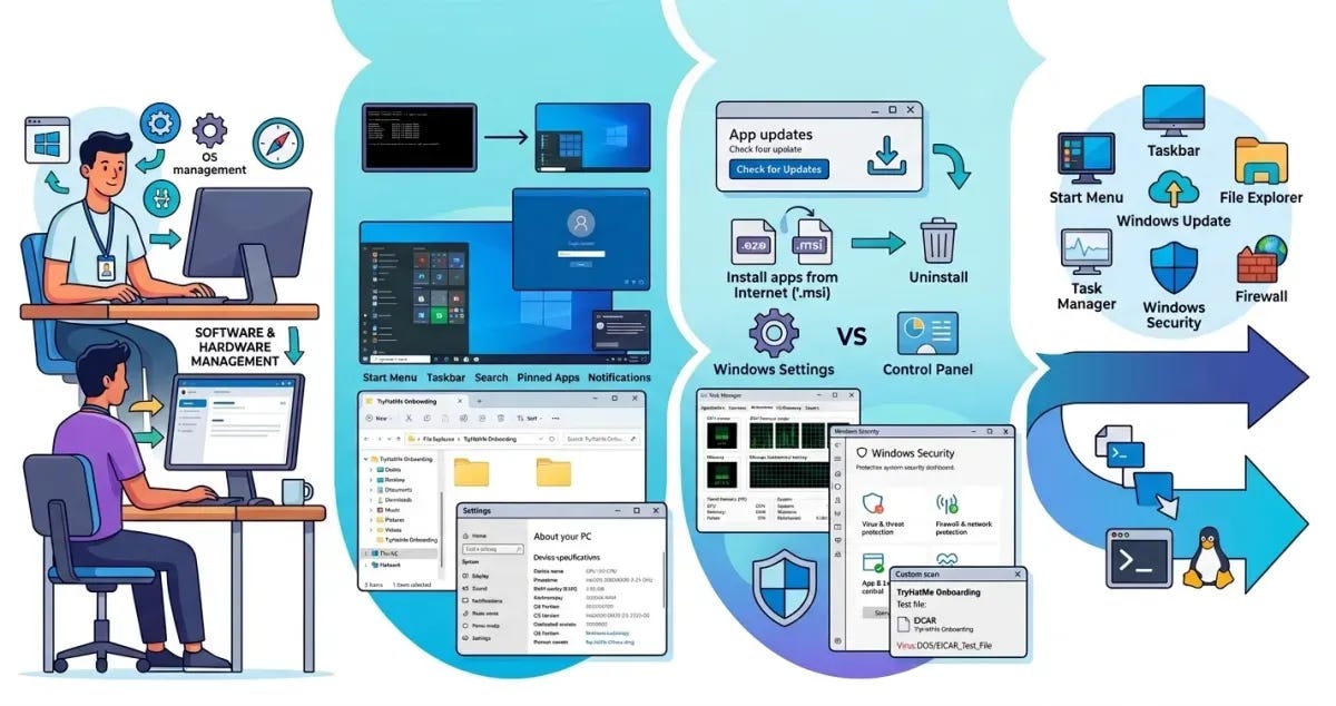 This task introduces the Microsoft Windows operating system, setting the scenario as your first day working at "TryHatMe." It outlines the learning objectives, such as navigating the graphical interface, using File Explorer, adjusting system settings, and utilizing basic tools like Task Manager. Prerequisites for this room include a foundational understanding of computer components and what an operating system is.